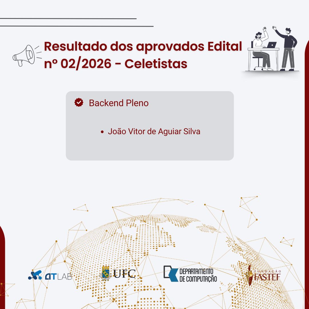 A Fundação FASTEF divulga a relação dos candidatos aprovados no Edital nº 02/2026, referente ao 2º Processo Seletivo de Celetistas 2026 para atuação nos projetos de pesquisa, desenvolvimento e inovação do ATLab/UFC, com interveniência da FASTEF.
